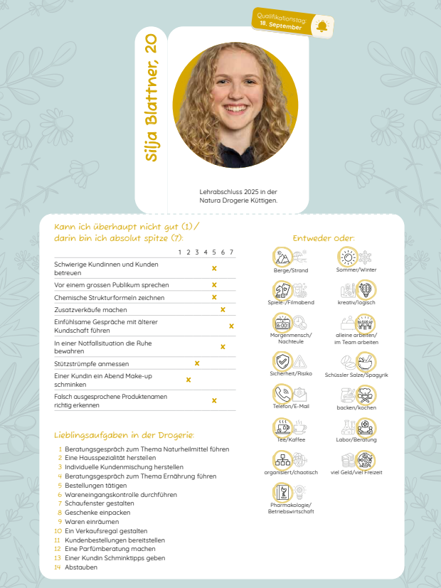 Silja bringt eine ausgeprägte Kundenorientierung, Einfühlungsvermögen und kommunikative Stärke mit – besonders im Umgang mit älterer Kundschaft oder in herausfordernden Situationen. Sie arbeitet gerne im Team, denkt strukturiert und organisiert und behält auch in stressigen Momenten einen kühlen Kopf. Fachlich interessiert sie sich besonders für pharmakologische Themen und bringt ein grosses Wissen in Naturheilmittel mit.